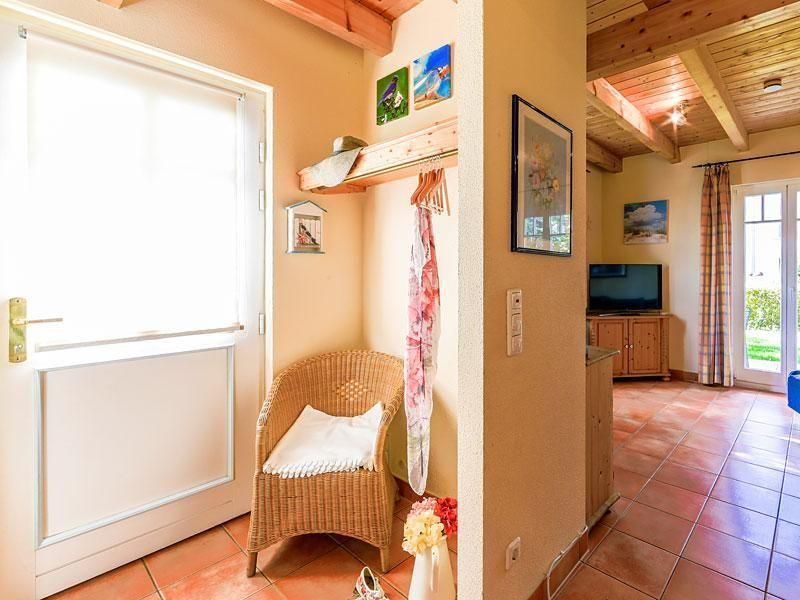 Der Eingangsbereich empfängt Sie mit einer einladenden Diele inklusive Garderobe mit Spiegel sowie einem separaten Abstellraum, in dem Sie bequem Gepäck, Vorräte oder Strandausrüstung unterbringen können.