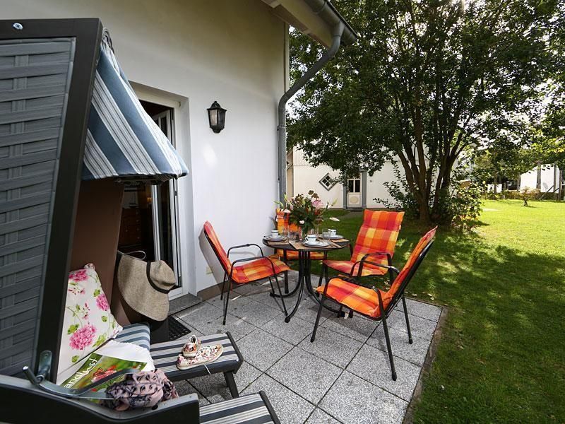 Genießen Sie das Ostsee-Feeling mit der ganzen Familie auf der romantisch anmutenden Terrasse, die Ihnen einen fantastischen freien Blick auf die Ruhe ausstrahlende Umgebung mit weitläufigen Rasenflächen, die das Ferienhaus umfassen, bietet. Moderne Gartenmöbel und ein hübscher Strandkorb laden zum gemütlichen Verweilen ein und vervollständigen das harmonische Ambiente im Außenbereich des Hauses.