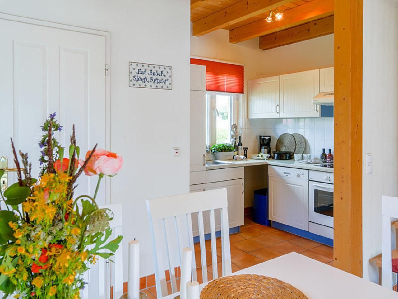 Die moderne, voll ausgestattete Einbauküche lässt keine Wünsche offen: 4-Felder-Herd, Backofen, Mikrowelle, Kühlschrank mit Gefrierfach, Geschirrspüler – hier ist alles vorhanden, um Ihre Lieblingsgerichte im Handumdrehen zuzubereiten. Gemeinsam speisen Sie am großzügigen Esstisch für 6 Personen, der nahtlos in den Wohnbereich integriert ist – gesellige Abende sind garantiert.