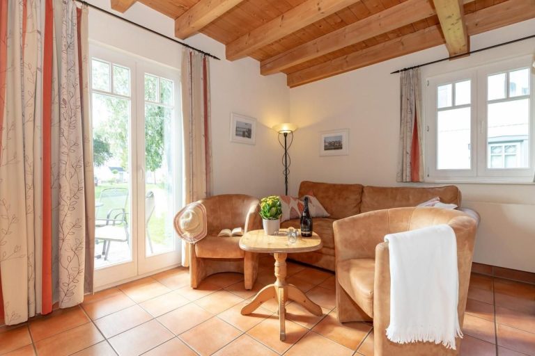 Im Erdgeschoss erwartet Sie ein liebevoll gestalteter Wohnbereich mit zwei bequemen Sesseln und einer gemütlichen Schlafcouch, die sich bei Bedarf in einen komfortablen Schlafplatz für zwei Personen verwandeln lässt. Warme Farben, stilvolle Dekoration und hochwertige Möbel schaffen eine behagliche Atmosphäre – perfekt für entspannte Abende nach einem erlebnisreichen Tag an der Ostsee.