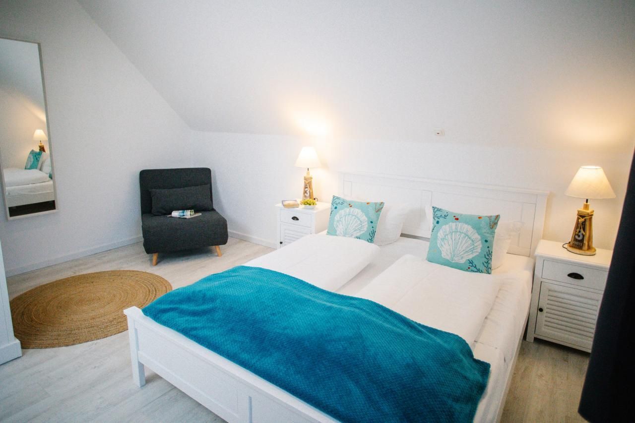 Im Erdgeschoss erwartet Sie ein liebevoll gestalteter Wohnbereich mit zwei bequemen Sesseln und einer gemütlichen Schlafcouch, die sich bei Bedarf in einen komfortablen Schlafplatz für zwei Personen verwandeln lässt. Warme Farben, stilvolle Dekoration und hochwertige Möbel schaffen eine behagliche Atmosphäre – perfekt für entspannte Abende nach einem erlebnisreichen Tag an der Ostsee. Für kalte Tage gibt es einen elektrischen Kamin.