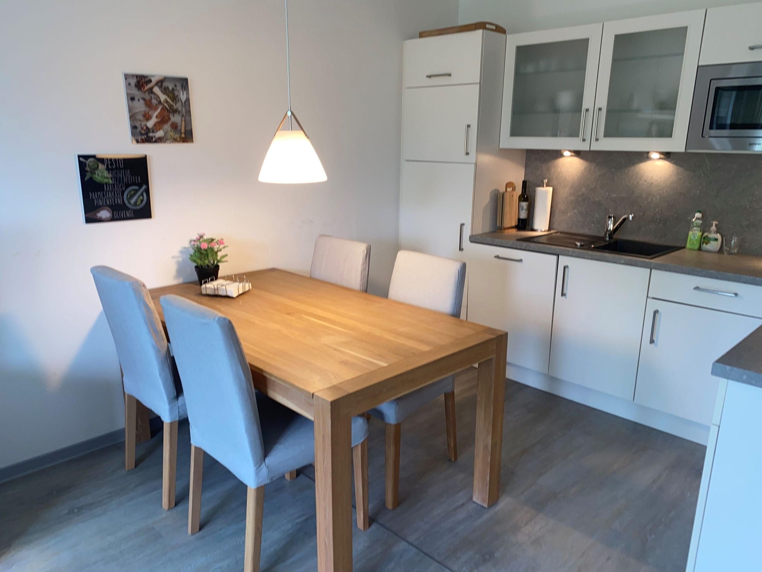 Toaster. Im Essbereich befindet sich ein großer Esstisch mit sechs Stühlen. Ein