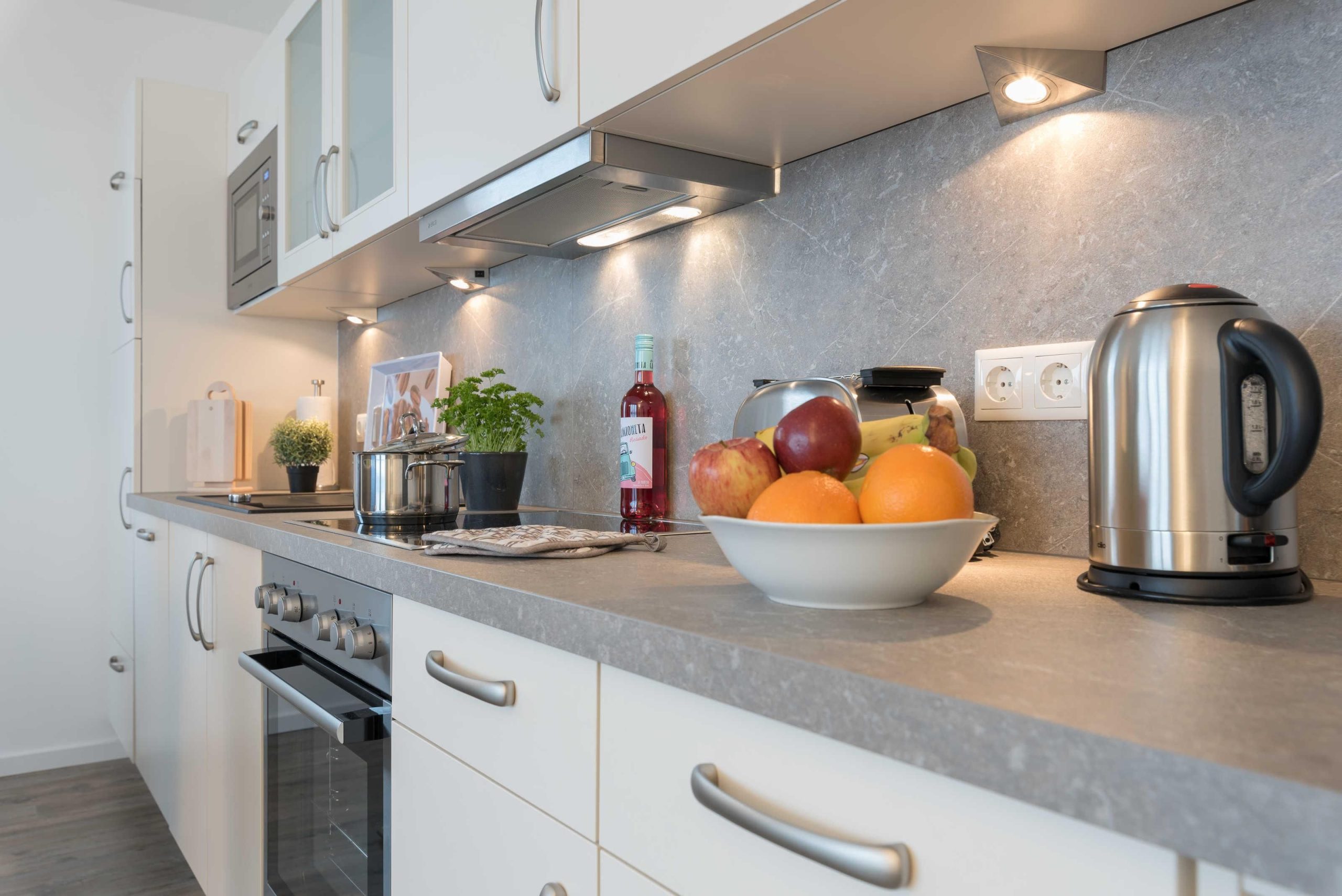 Kühl- und Gefrierschrank, einen Backofen, ein Cerankochfeld, eine Mikrowelle,