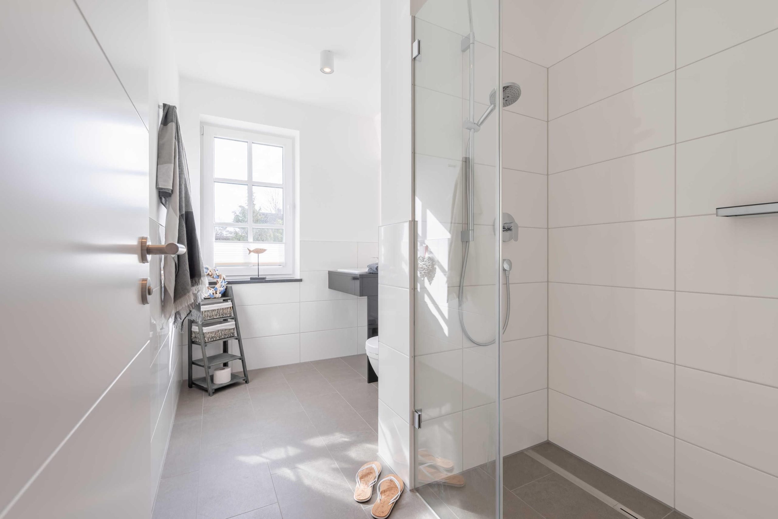 Das Badezimmer mit Fenster ist mit einer bodenebene Dusche inklusive
