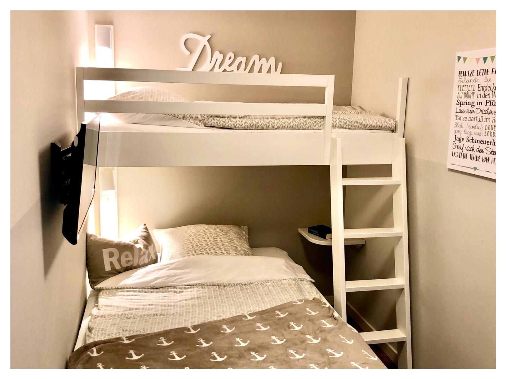 • Schlafzimmer 2: Boxspringbett (140 × 200 cm) + Hochbett (190 × 80 cm, abnehmbare Leiter), Smart-TV