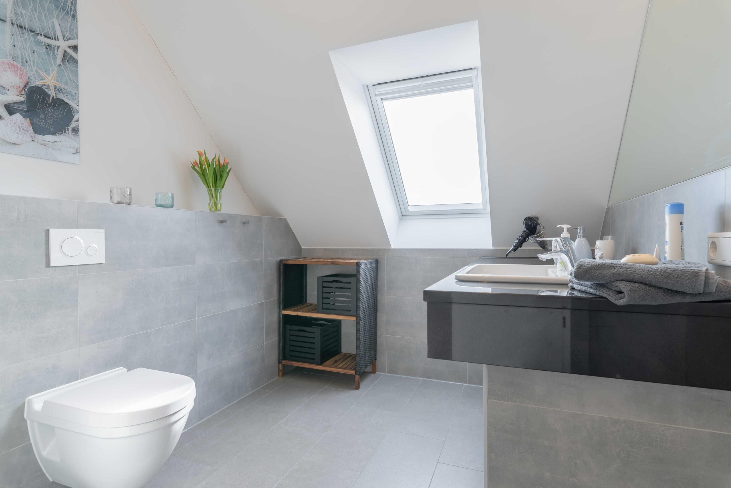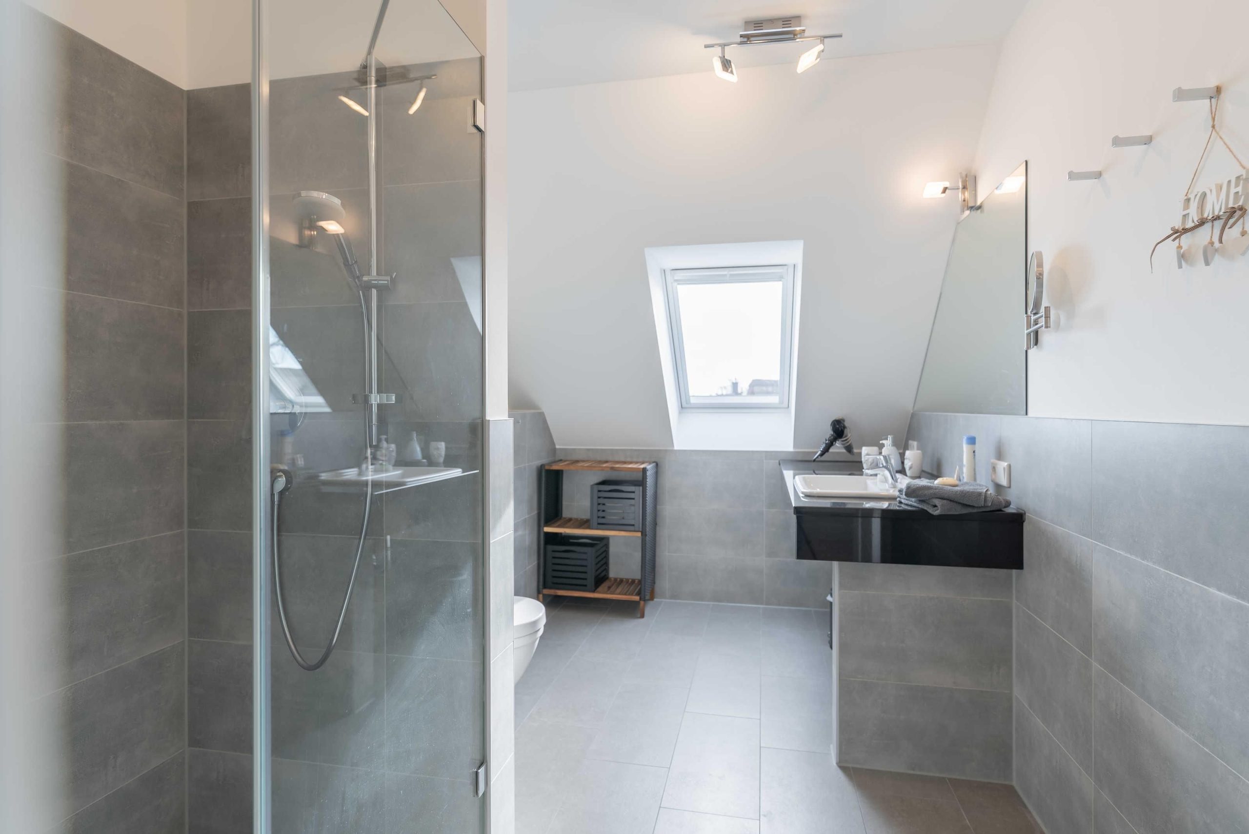 Das elegante Bad ist mit einer bodengleichen Dusche, einem Waschtisch mit großem