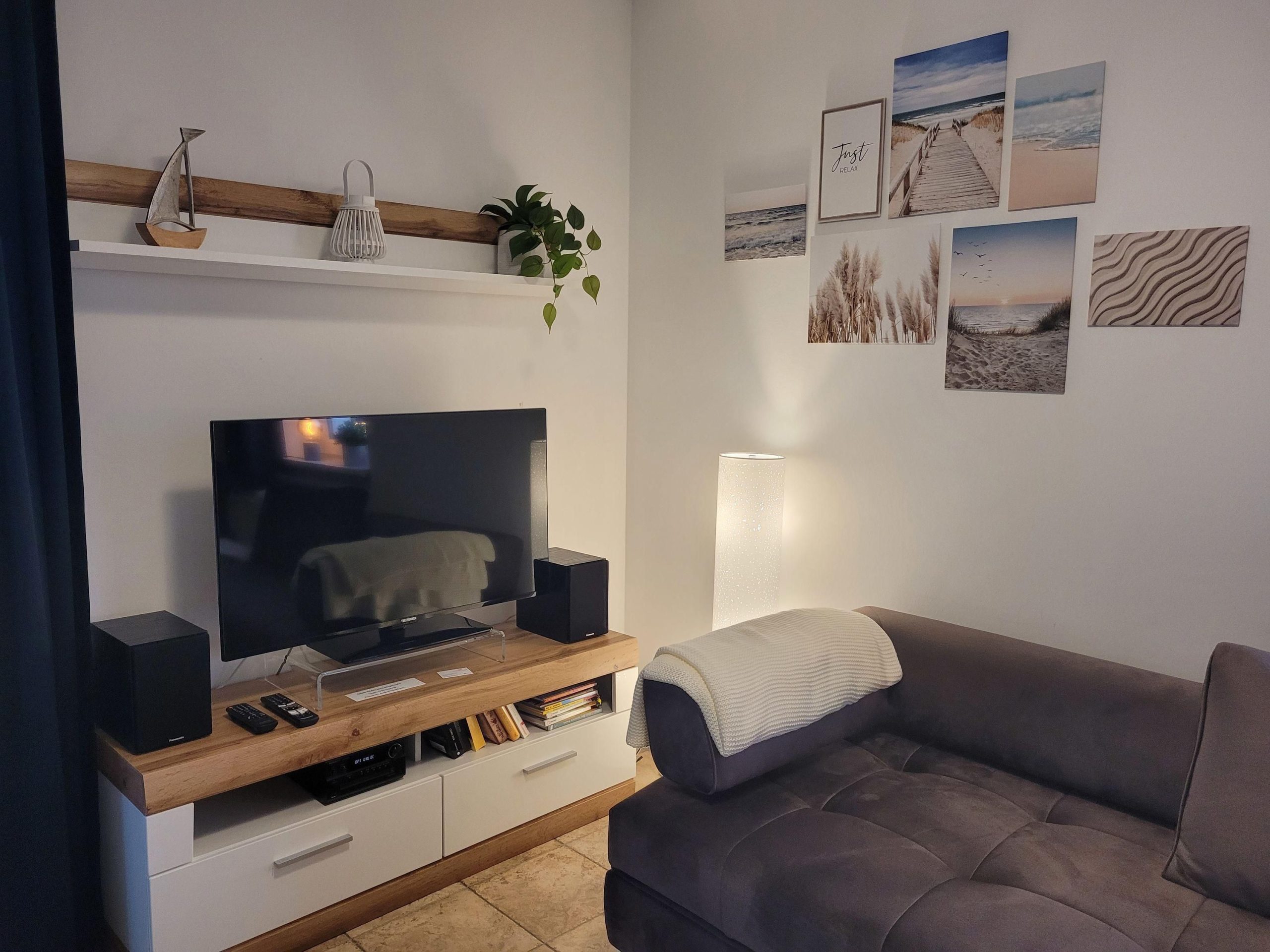 Das Wohnzimmer mit großer (Schlaf-)Couch, Flat-TV und gemütlichem Essbereich