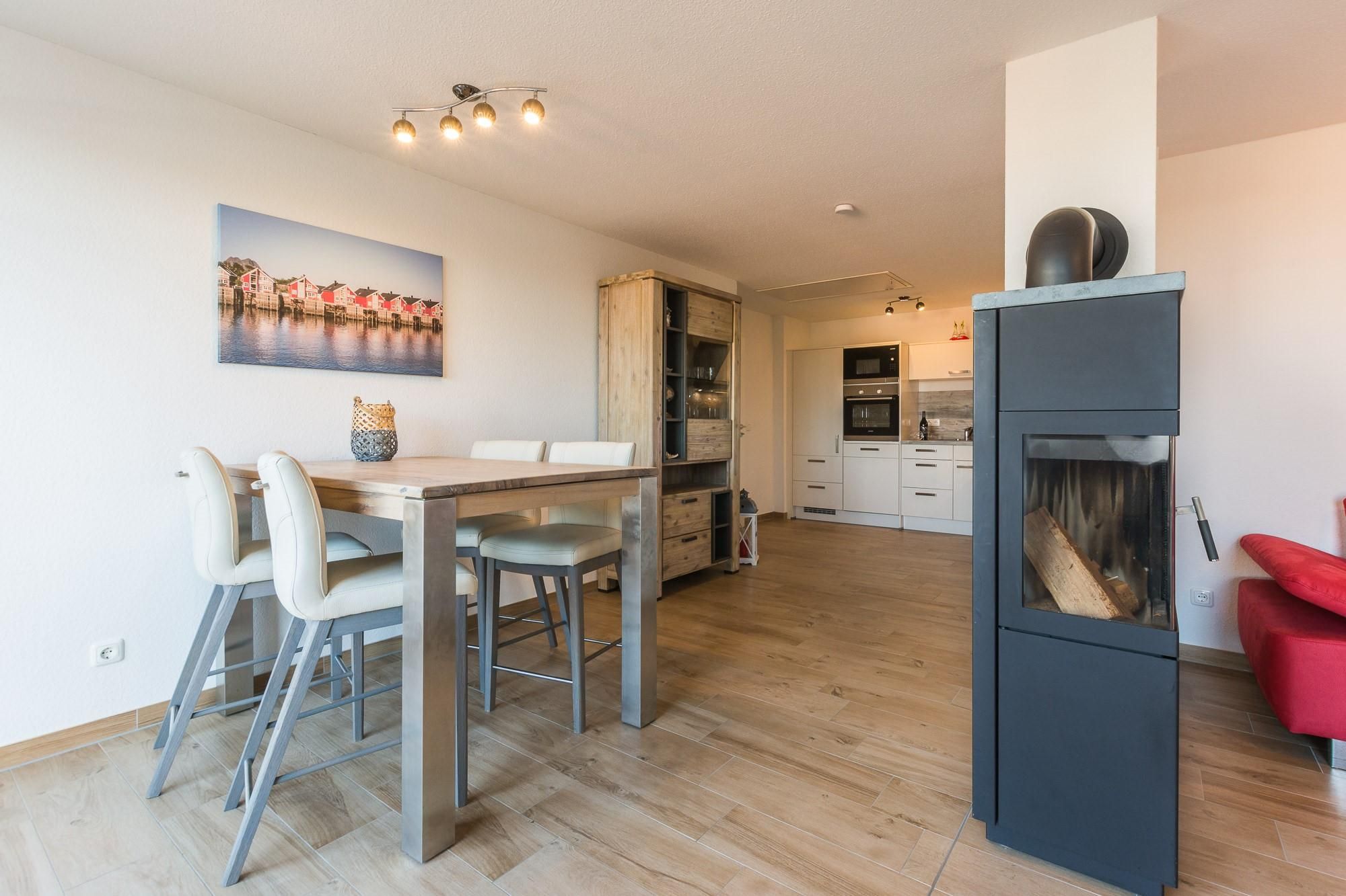 Der offener Wohn- und Essbereich mit LED-TV, Bluray Player und Holzkamin lädt
