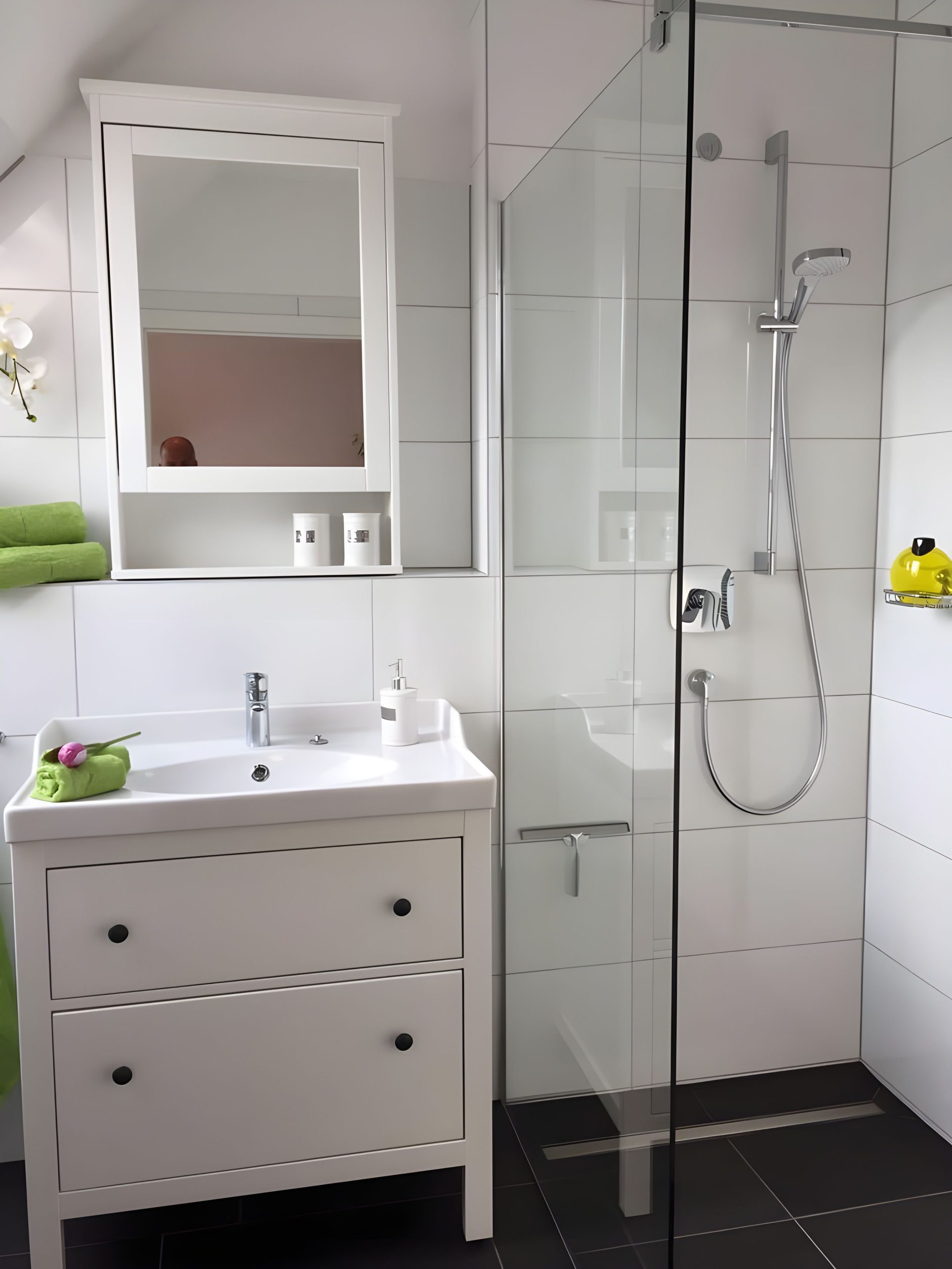 kleine Bad besticht mit ebenerdiger Dusche, geräumigem Waschtisch und Föhn.