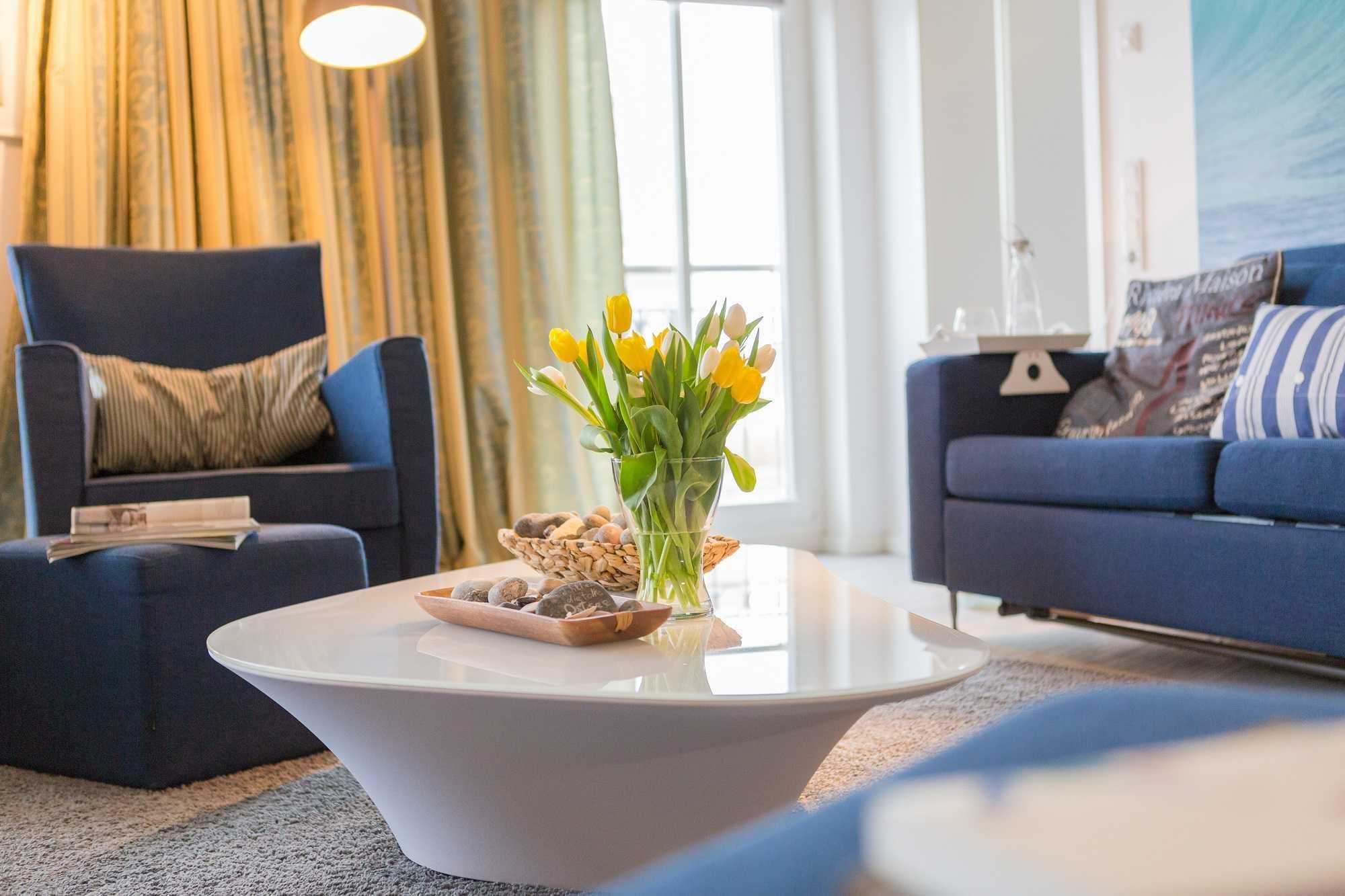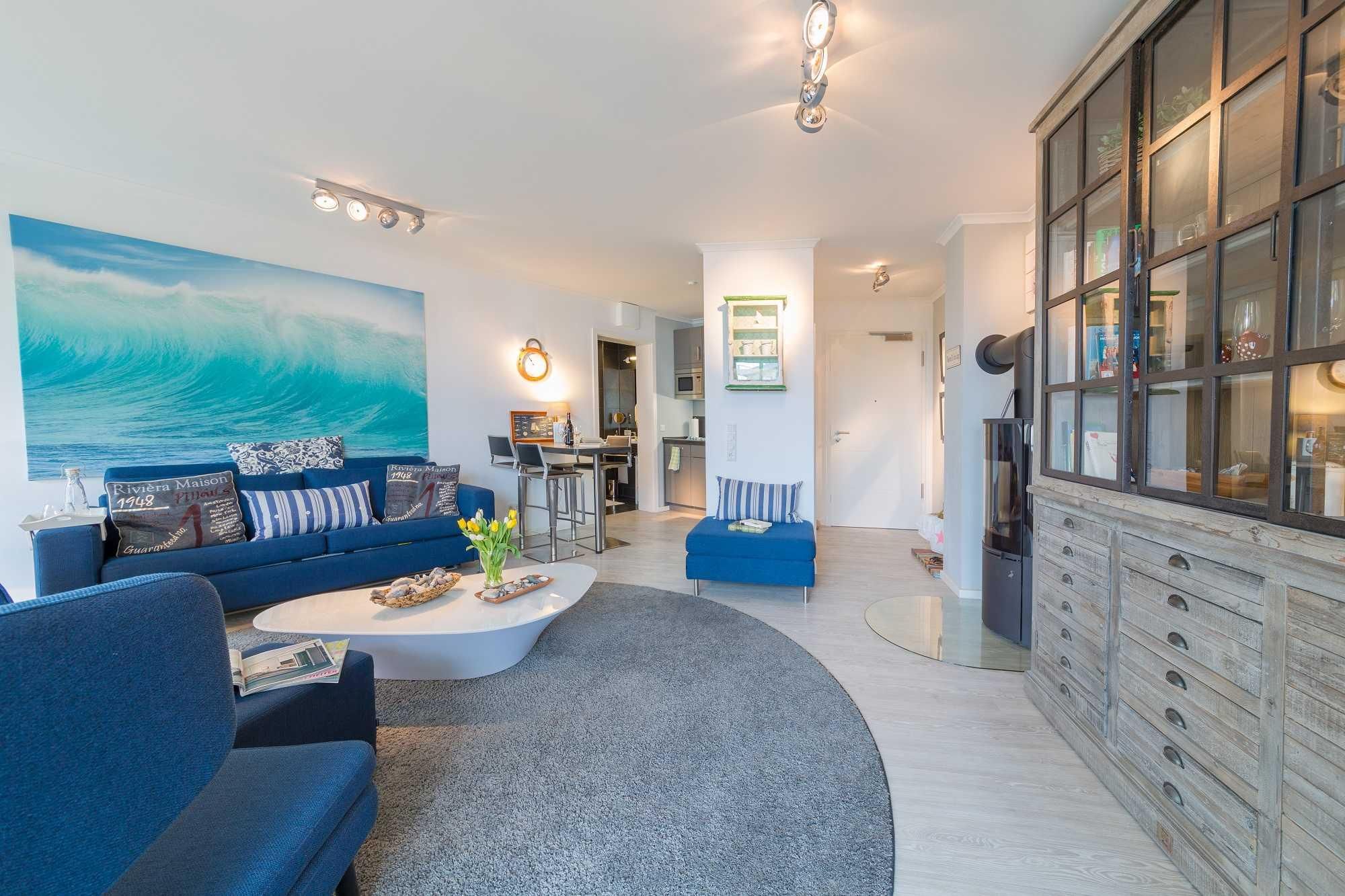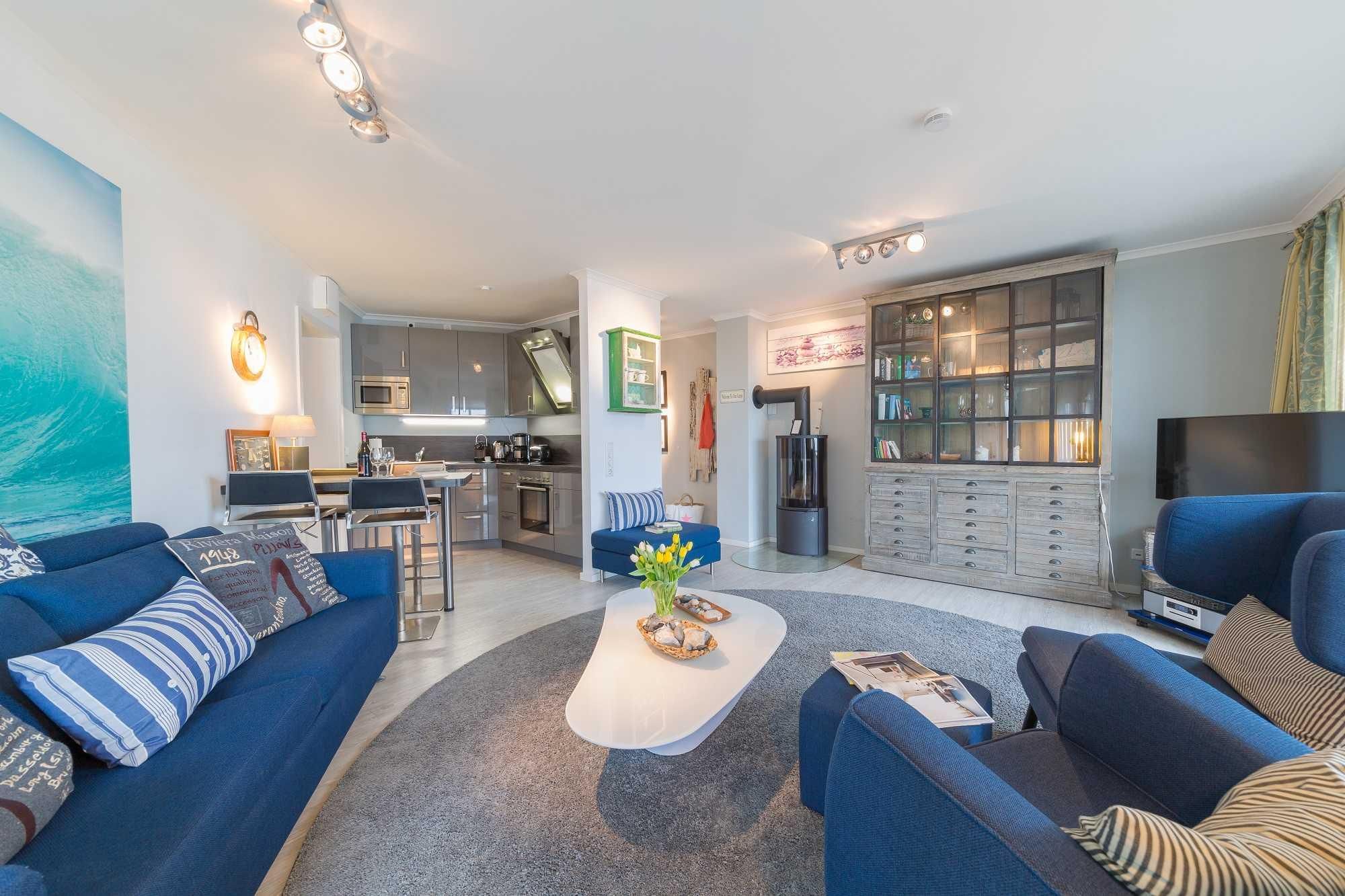 Das maritim eingerichtete Wohnzimmer verfügt über einen HD-Flatscreen-TV, einen