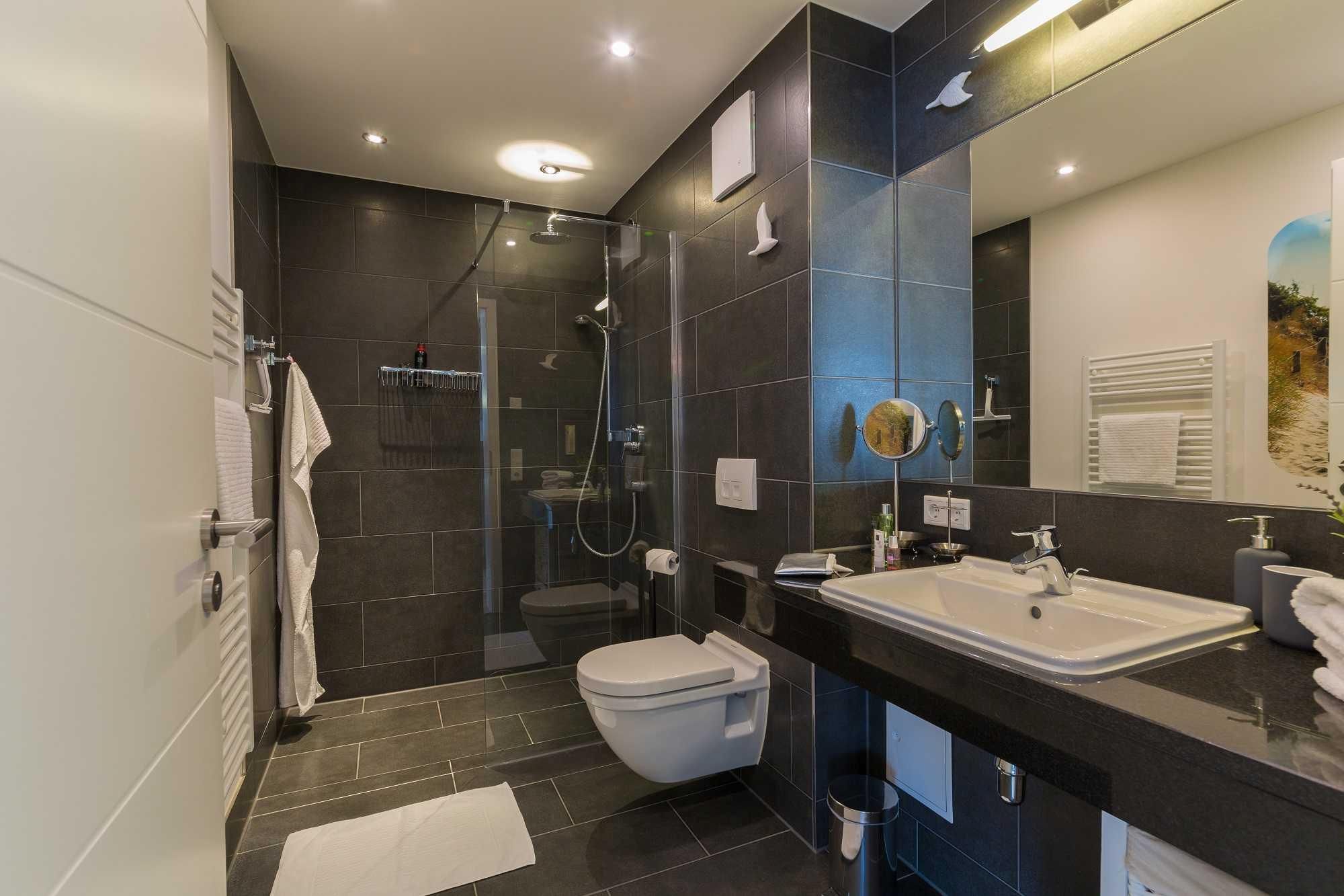 Duschbereich mit großer Kopfdusche sowie der definierte Waschtisch mit großem