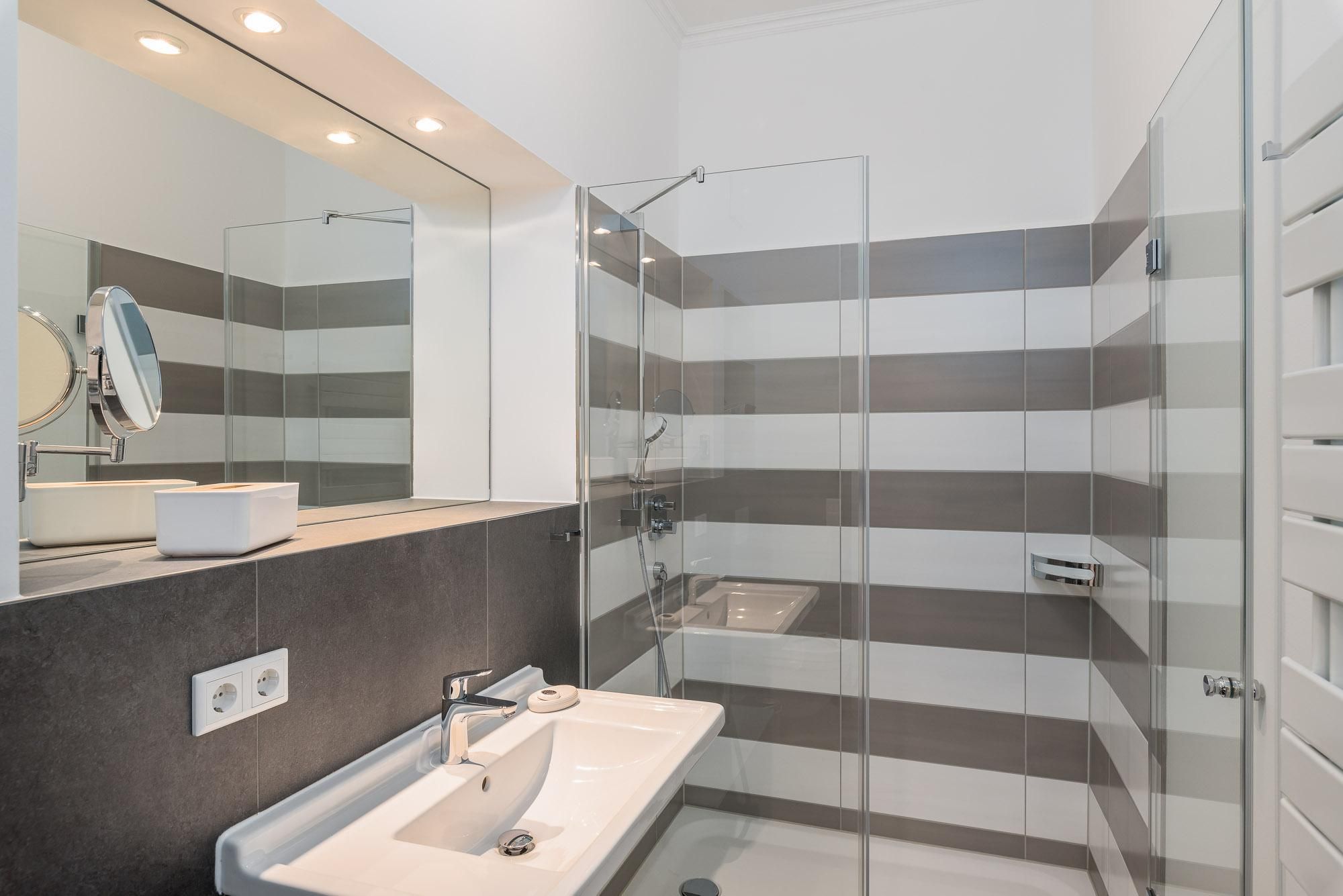 Das Bad verfügt über eine Dusche, einem Haartrockner und einem Handtuchtrockner.