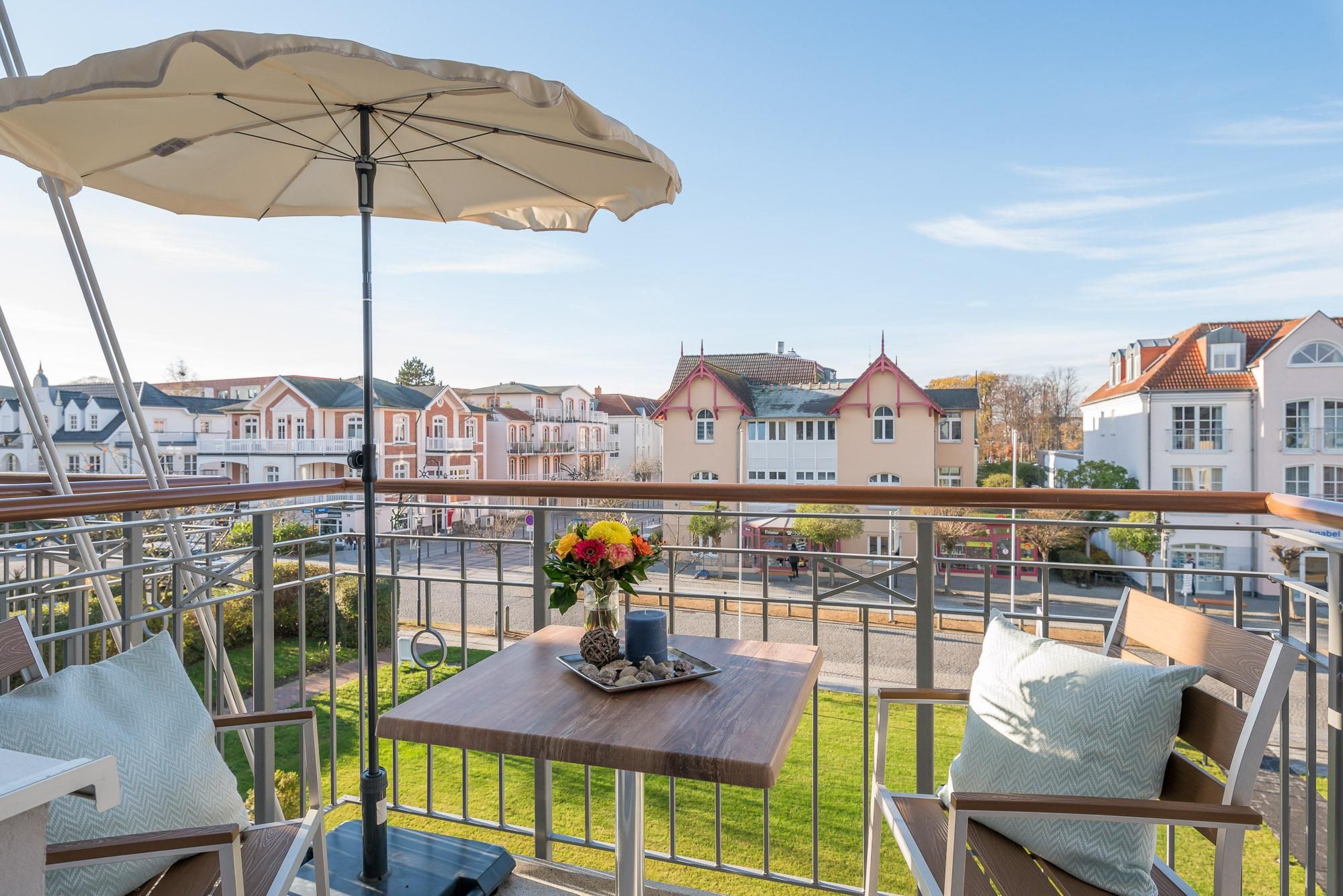 ist mit Balkonmöbeln und einem Sonnenschirm ausgestattet.