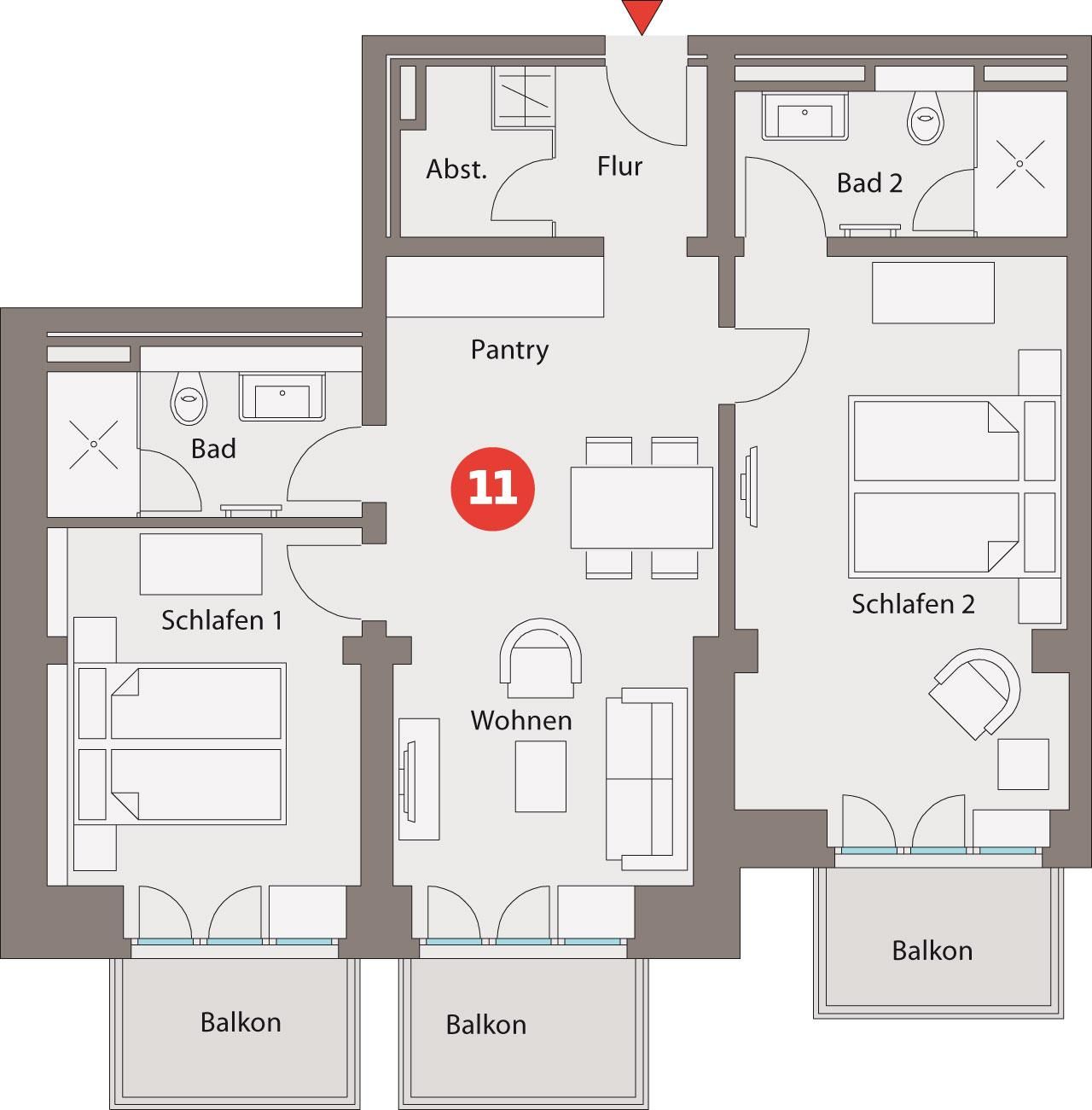 ca. 67 qm auch über drei Balkone. Diese sind mit Balkonmöbeln und einem