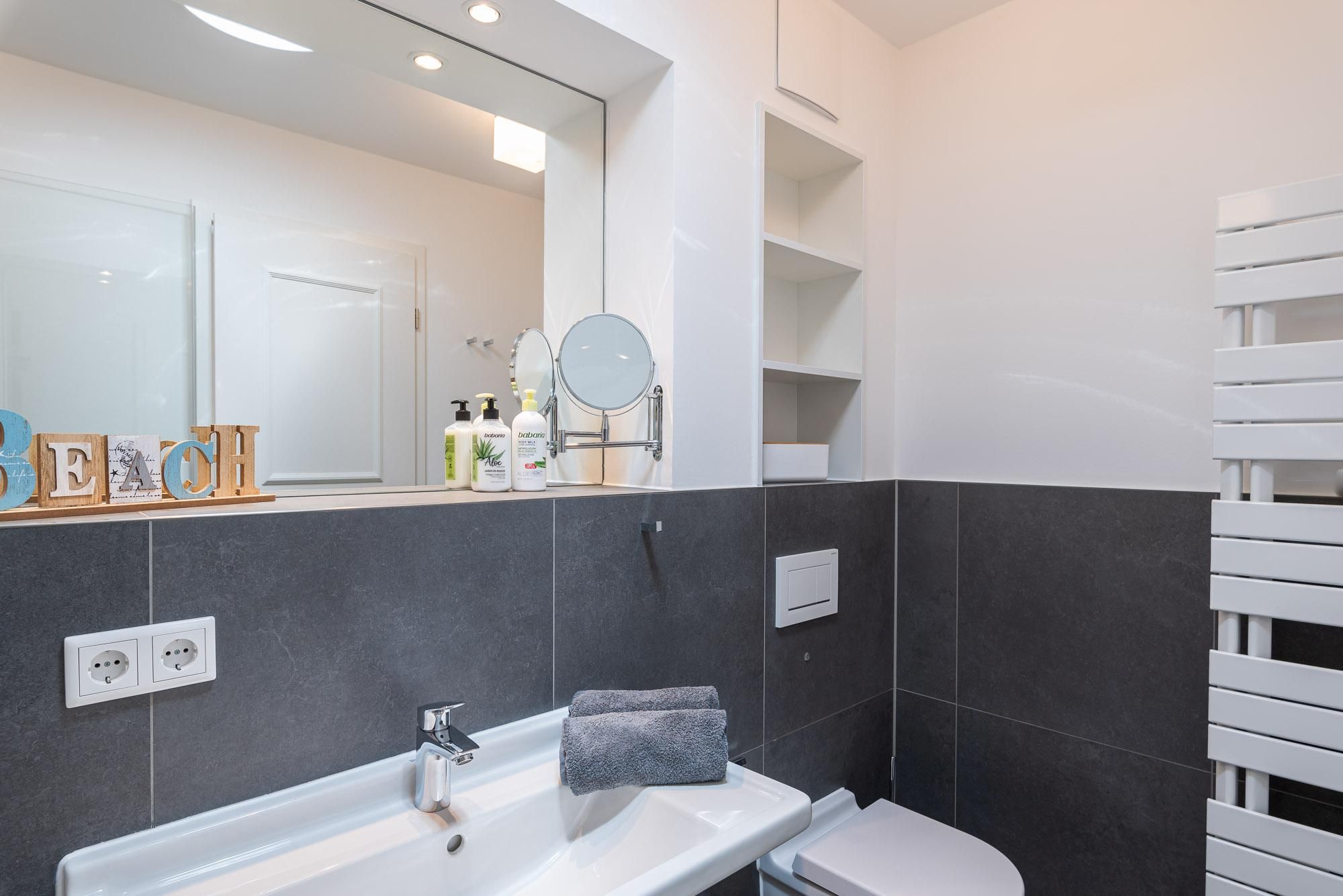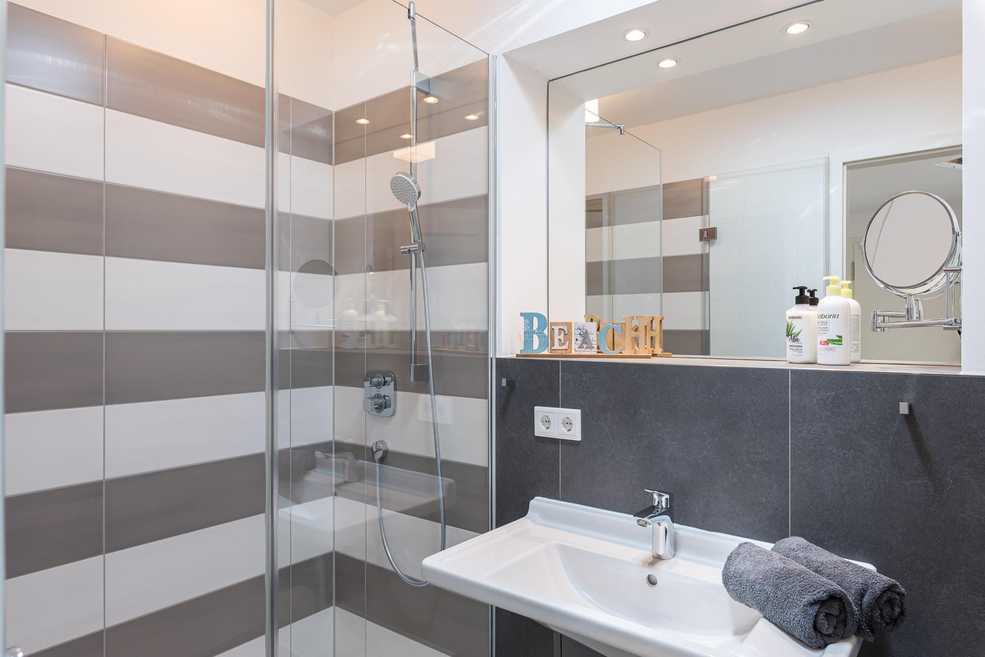 Das Bad verfügt über eine Dusche, einem Haartrockner und einem Handtuchtrockner.