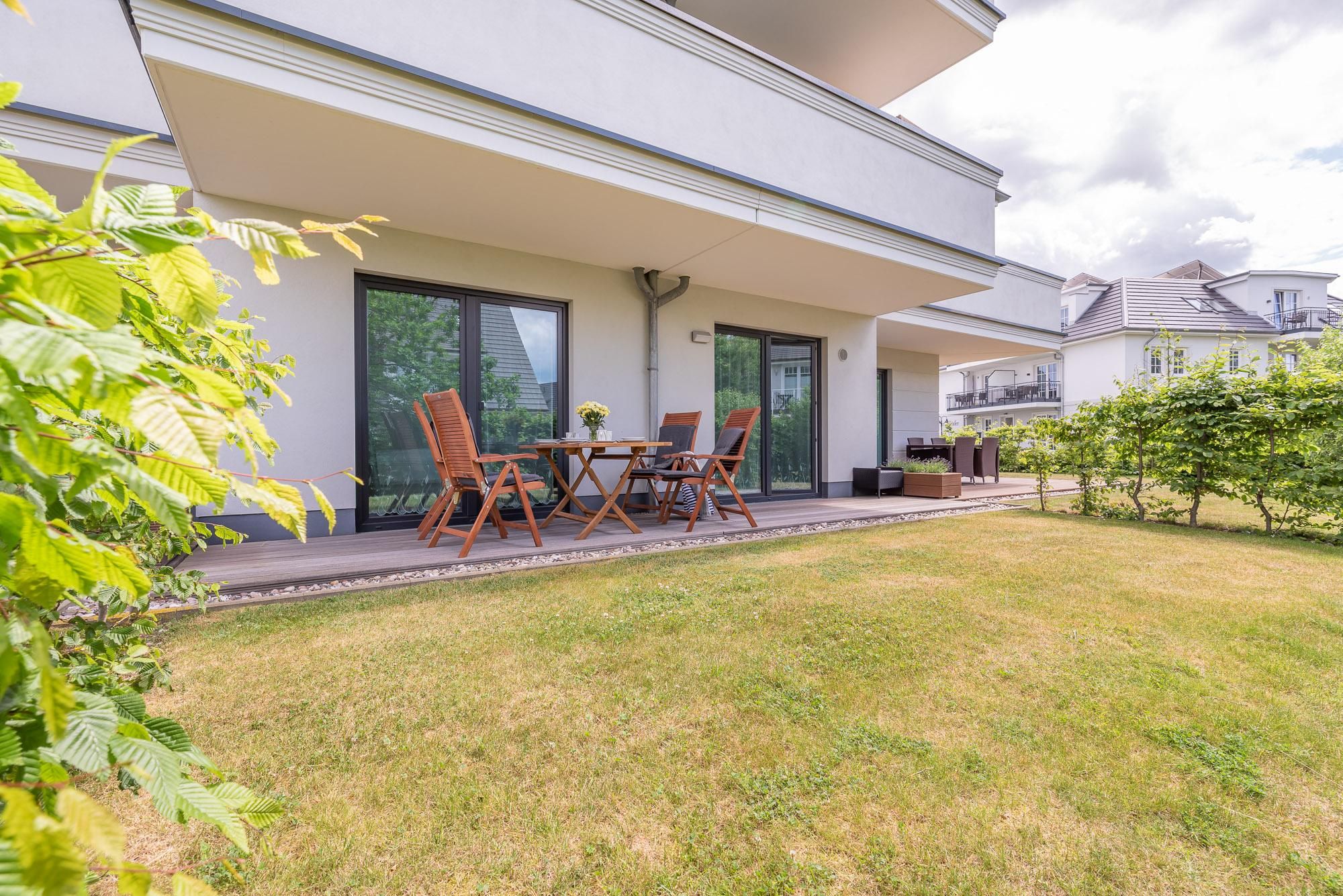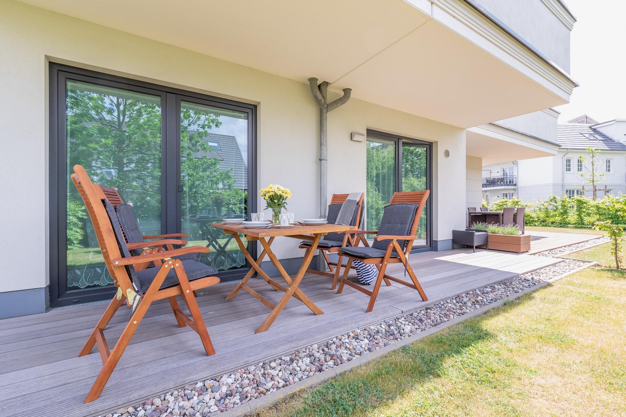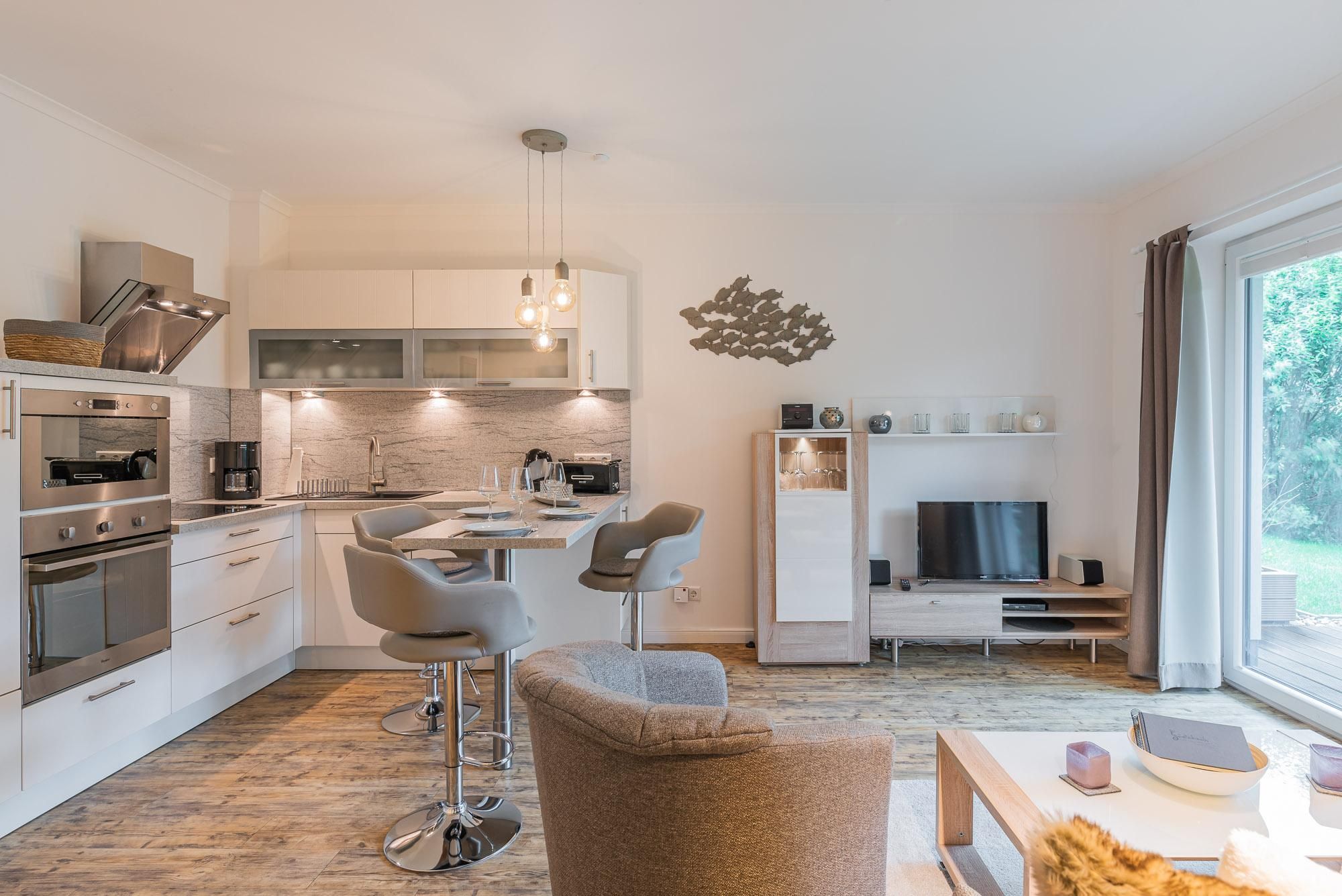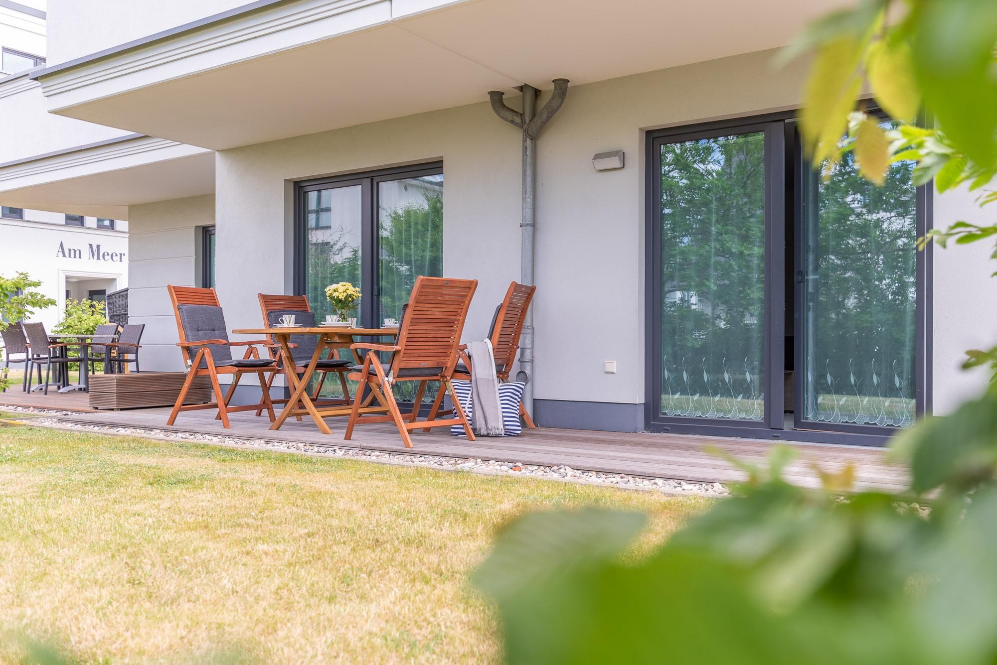 The Residenz Seestern WE 10 "Gartenlounge" offers a 48 m² ground floor apartment with a terrace, garden access, and modern amenities. Features include an open-plan kitchen with dishwasher, cable TV, free Wi-Fi, communal washer and dryer, private parking, and is suitable for up to three guests. Pets are allowed (one maximum).