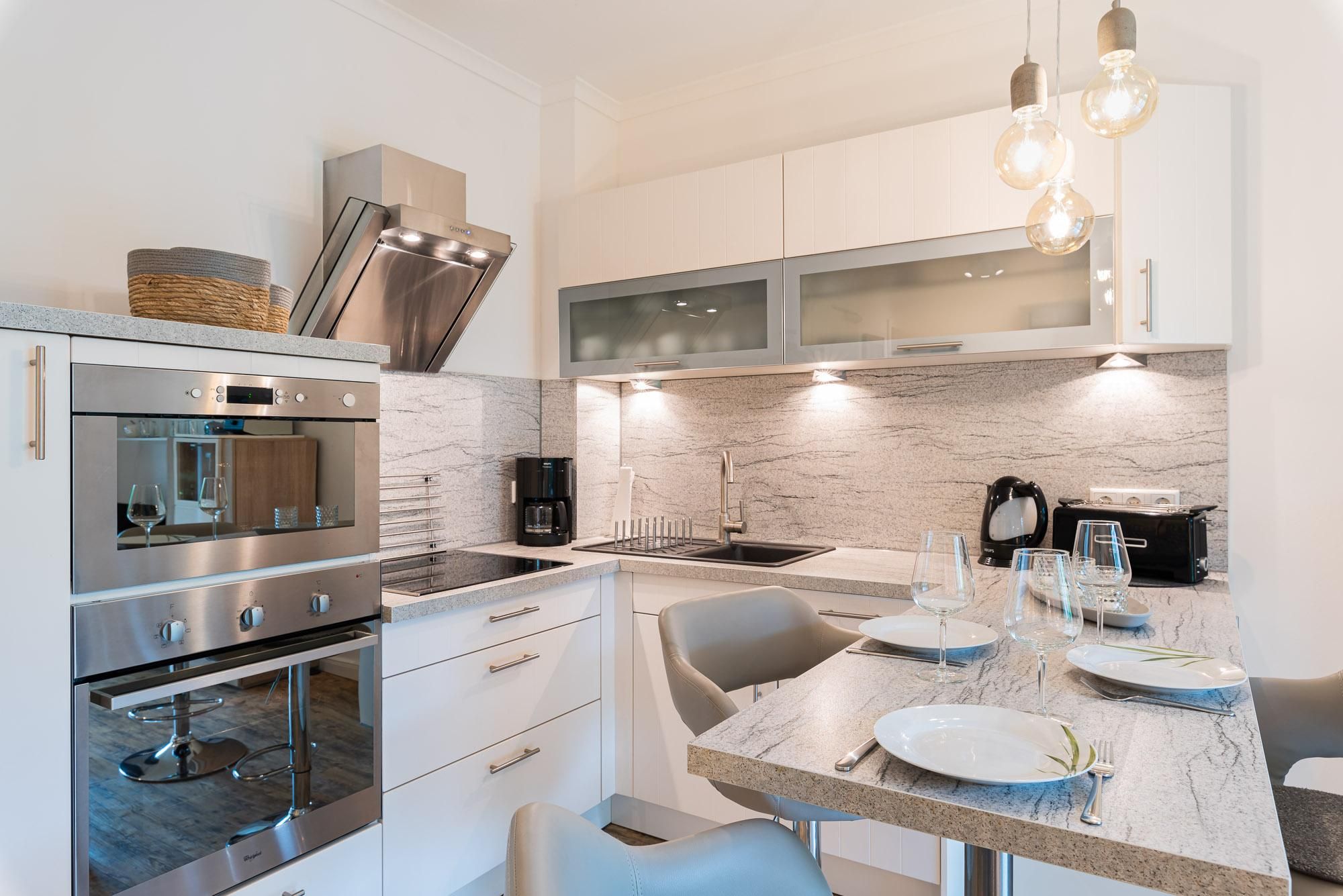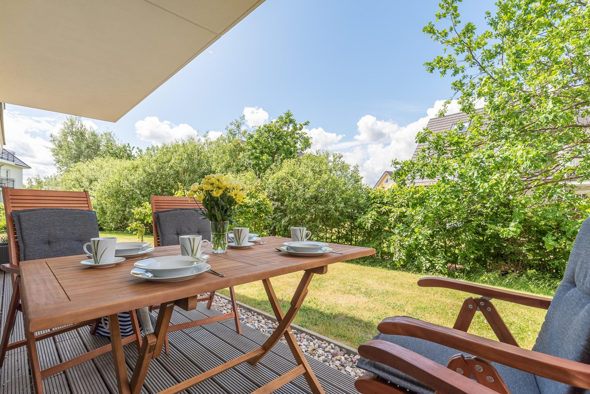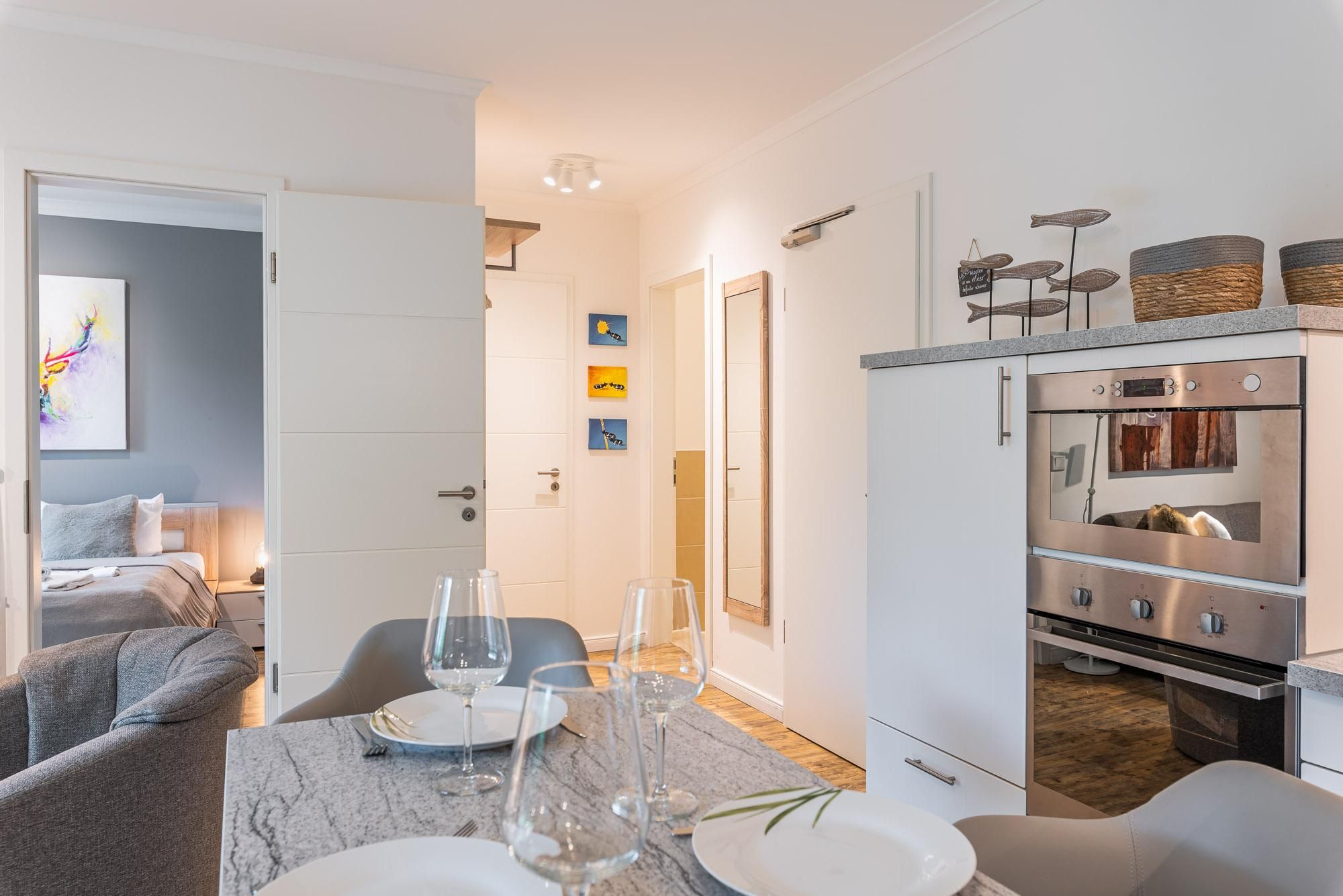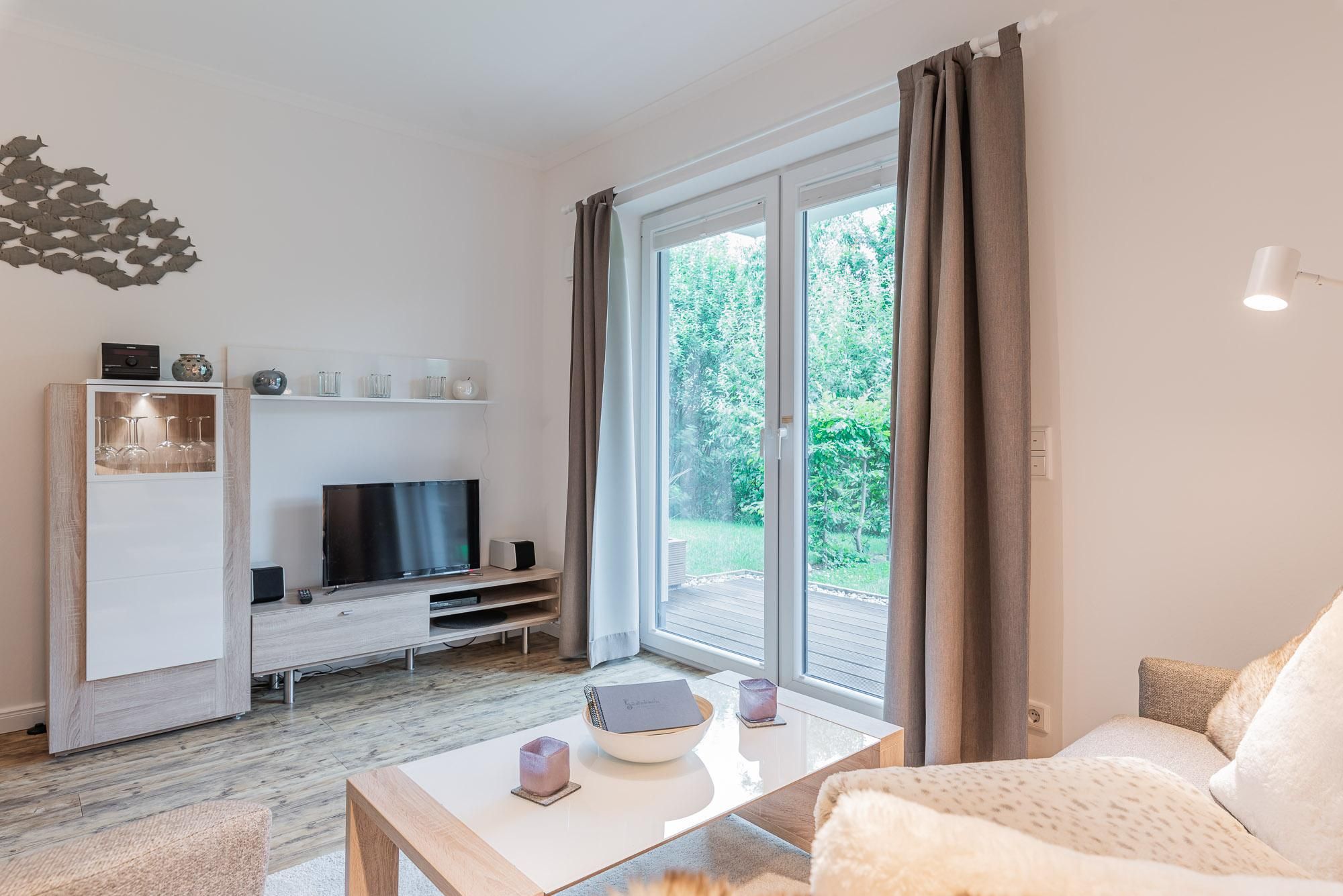 The Residenz Seestern WE 10 "Gartenlounge" offers a 48 m² ground floor apartment with a terrace, garden access, and modern amenities. Features include an open-plan kitchen with dishwasher, cable TV, free Wi-Fi, communal washer and dryer, private parking, and is suitable for up to three guests. Pets are allowed (one maximum).