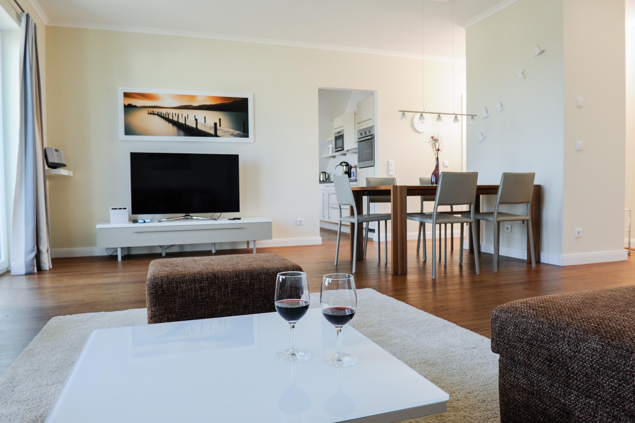 The comfortable, tastefully furnished living area is fitted with a sofa and forms the heart of the apartment. For your entertainment, a TV with cable connection, a Blu-ray player, DVD player, CD player, and a radio are available, ensuring a wide range of leisure options regardless of the weather.