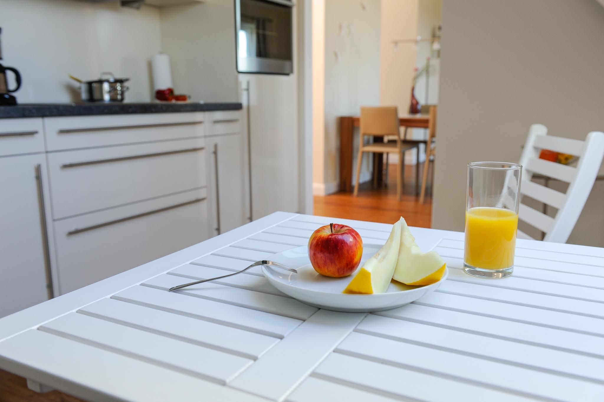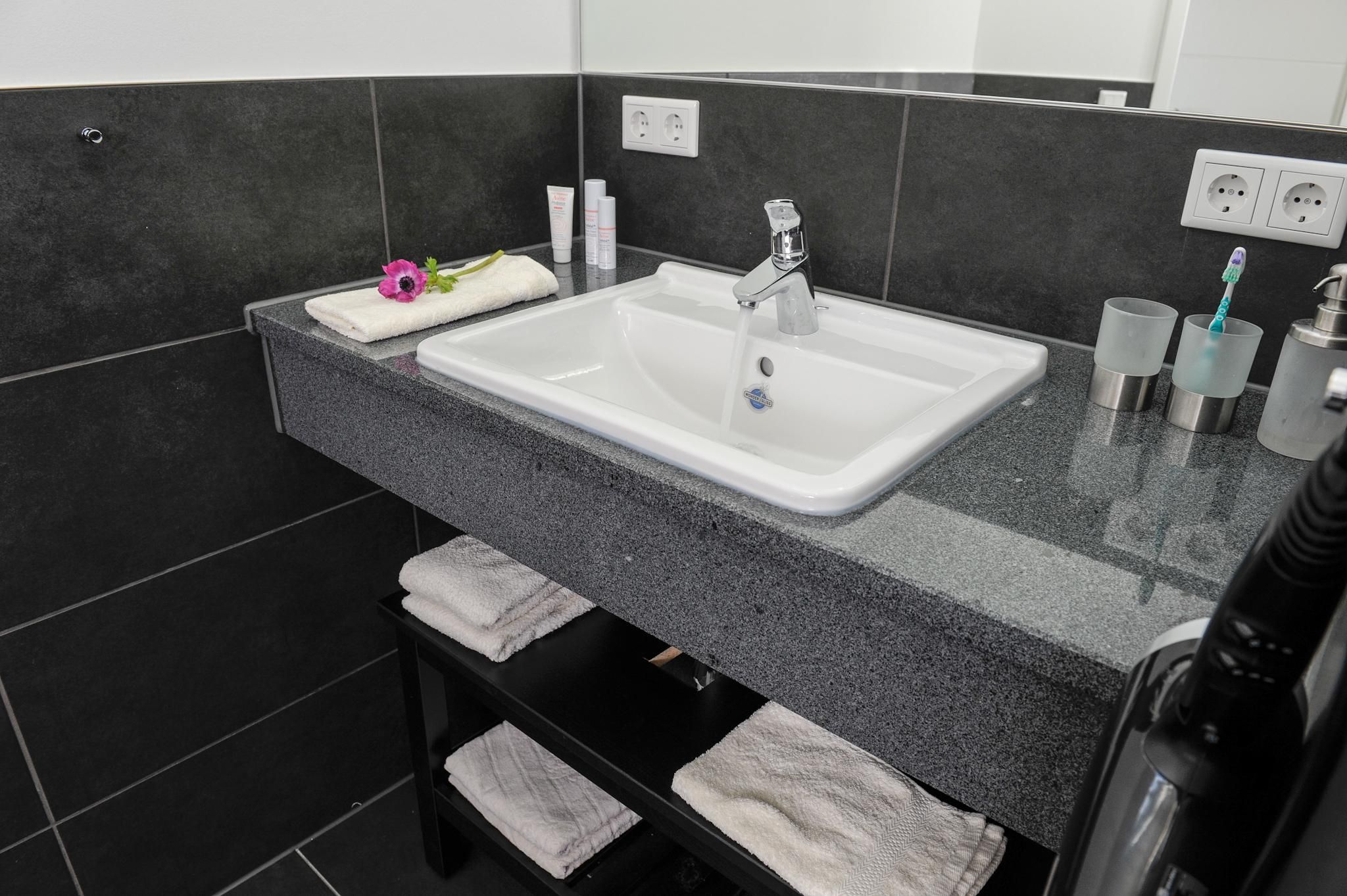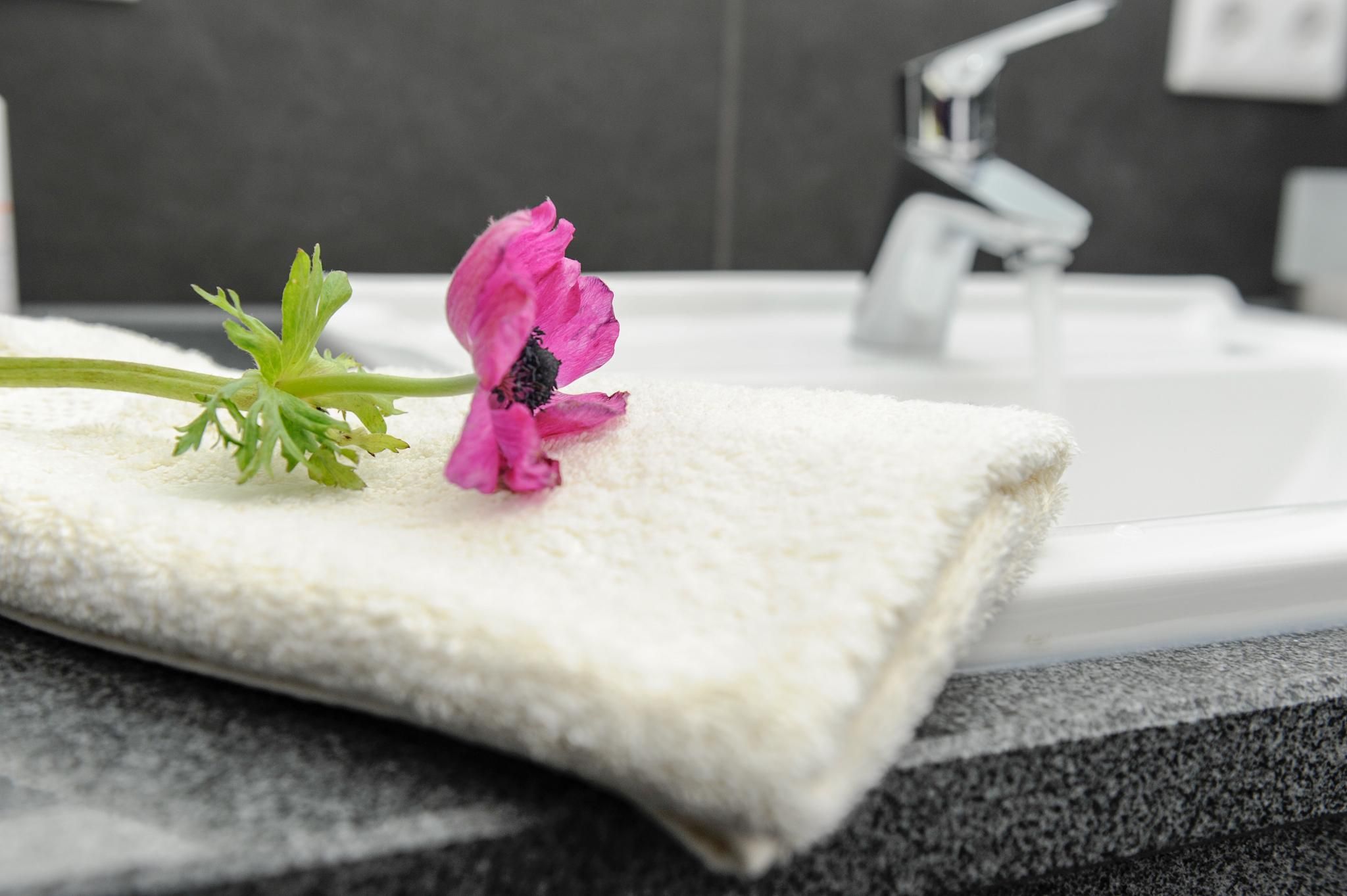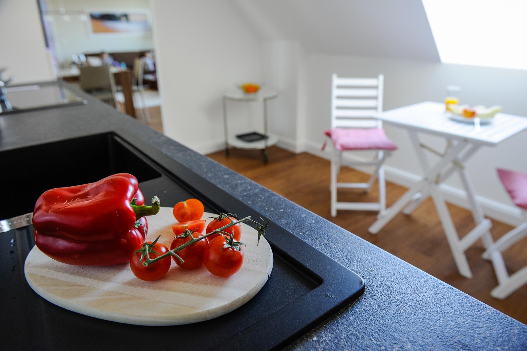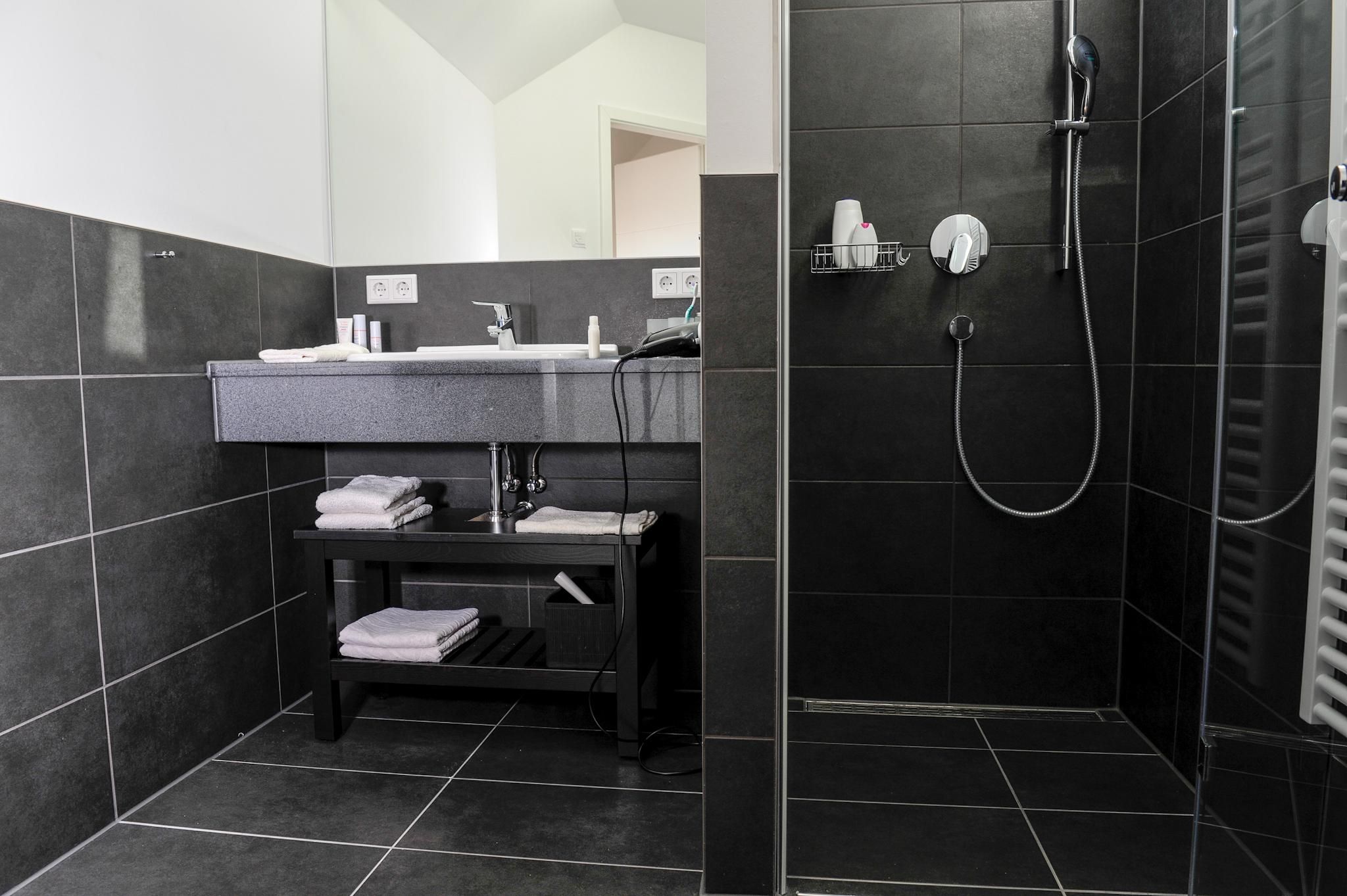 The bathroom features a spacious, walk-in shower and is equipped with a washbasin, hairdryer, and other amenities for your daily comfort. Underfloor heating guarantees pleasant warmth during cooler times of the year. The apartment is additionally fitted with free WLAN internet access and central heating.