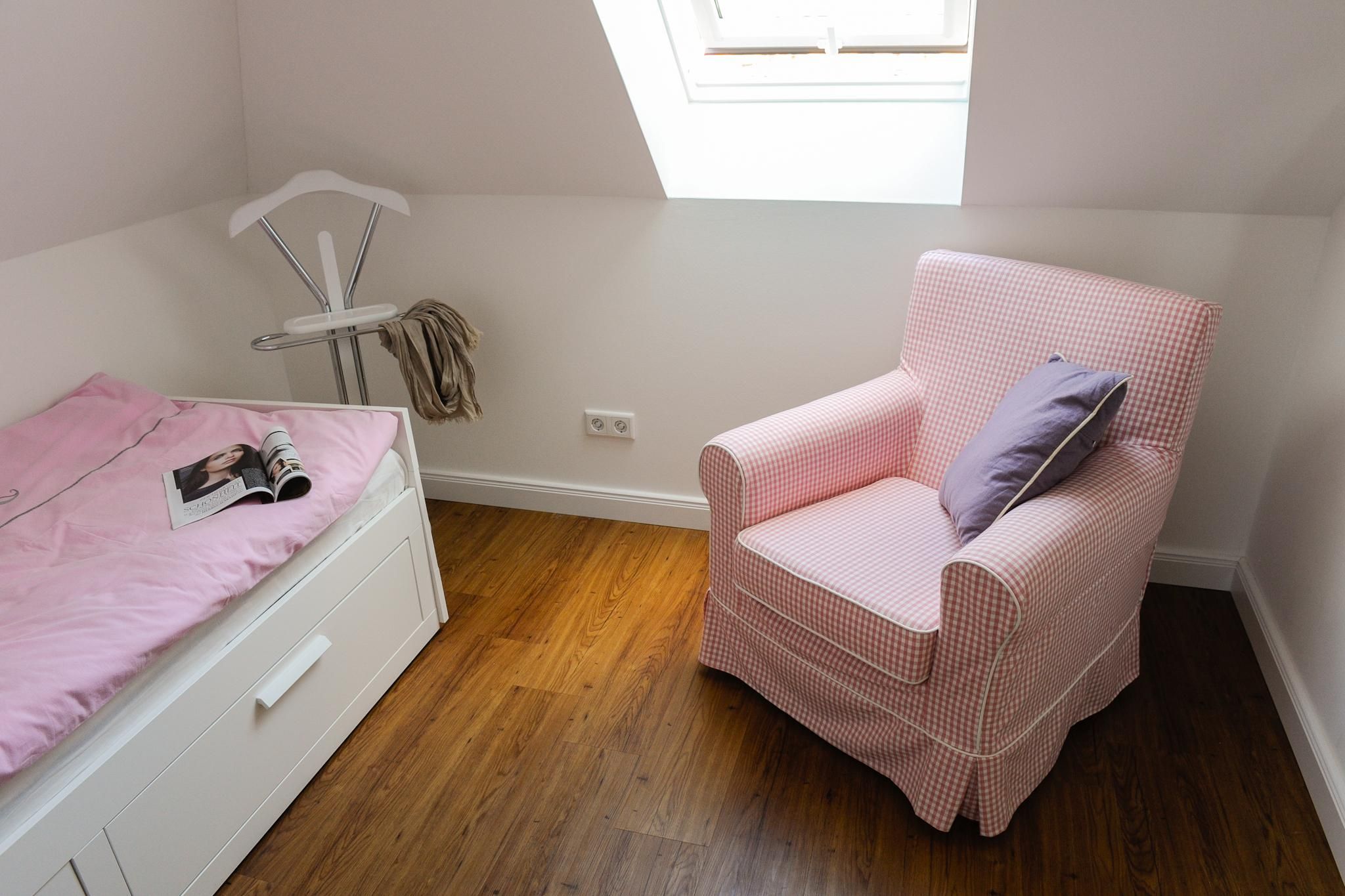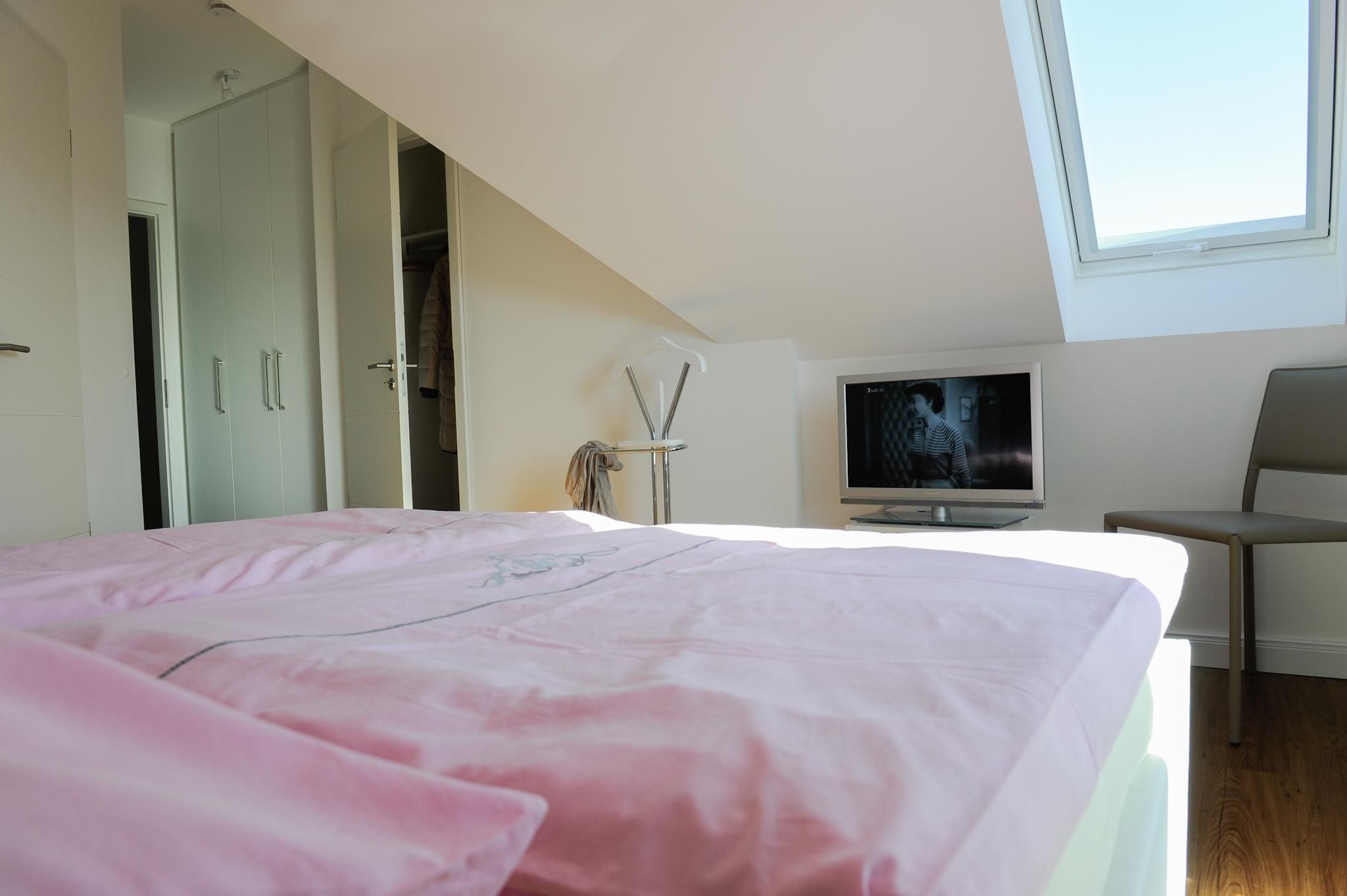 The penthouse encompasses three comfortably furnished rooms, including two separate bedrooms. Both sleep and relaxation are ensured for guests of all ages, with a total of five sleeping accommodations. A baby cot is also available, making the apartment especially suitable for families with young children. Children are warmly welcomed in this non-smoking accommodation, which also features a smoke detector for added safety.