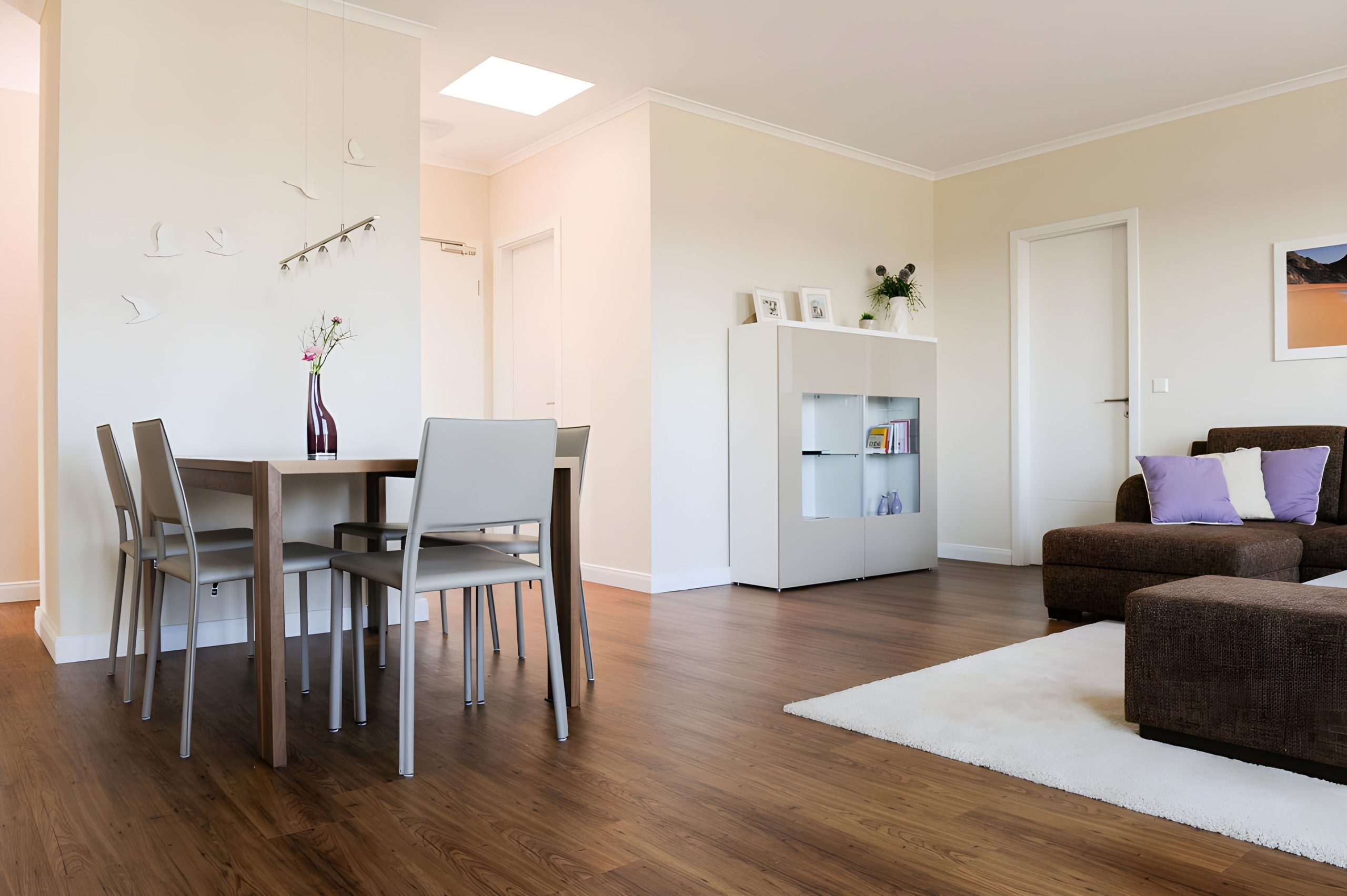 The modern open-plan kitchen is seamlessly integrated into the living area and invites you to enjoy shared cooking experiences. It is equipped with contemporary appliances, among them a ceramic hob, oven, refrigerator, freezer, dishwasher, microwave, toaster, water kettle, coffee machine, and a separate espresso machine. All necessary utensils, as well as cutlery and plates, are at your disposal. A convenient dining area with a large table connects the kitchen and living spaces, making it ideal for memorable meals with your family or friends.